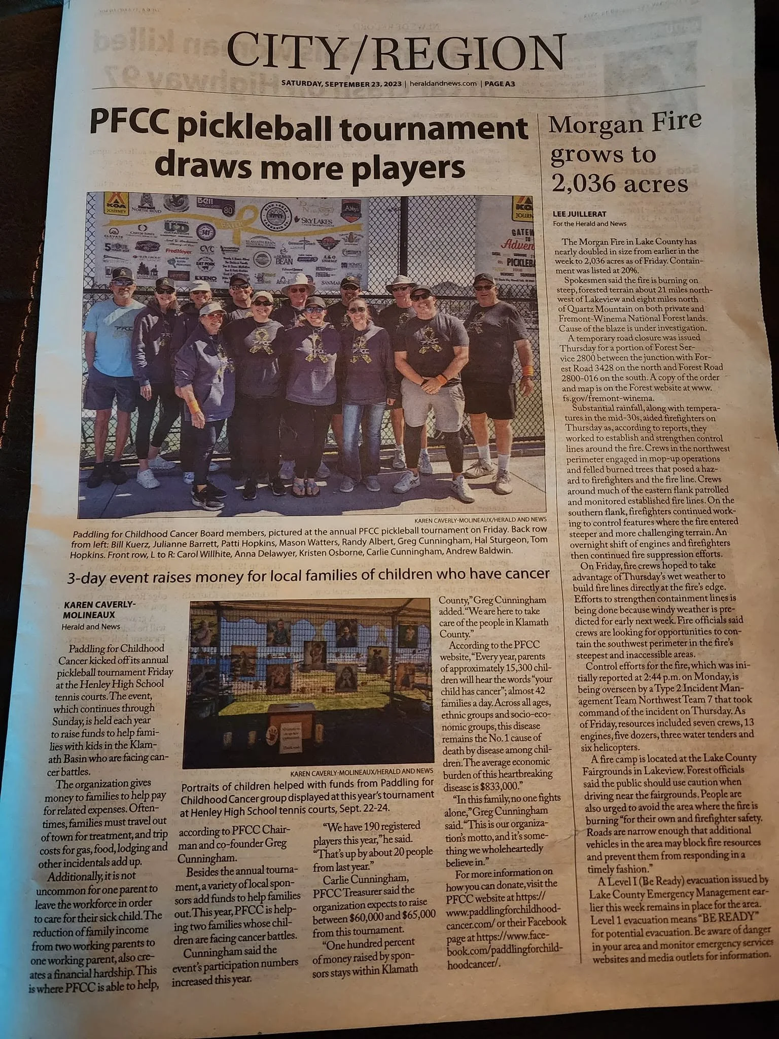 Paddling for Childhood Cancer was created by a dedicated team of pickleball enthusiasts in 2019, in hopes of raising funds to offset medical and household needs for families battling childhood cancer in the greater Klamath Falls, Oregon area.